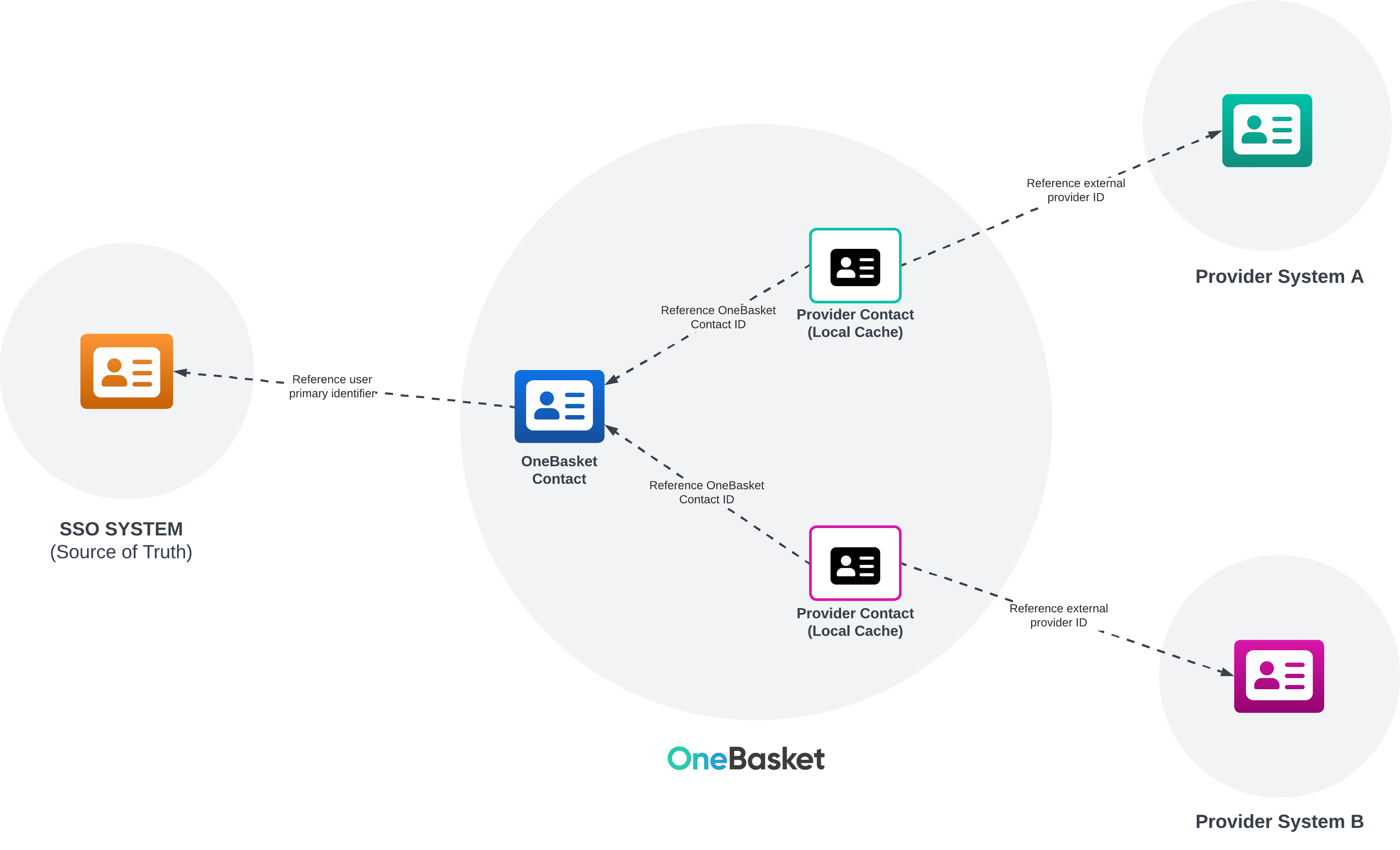 To plug the holes that are generally left after SSO integrations take place, OneBasket has it's own contact linking mechanisms in place to ensure that the customer's identity can be unified across all provider system APIs.